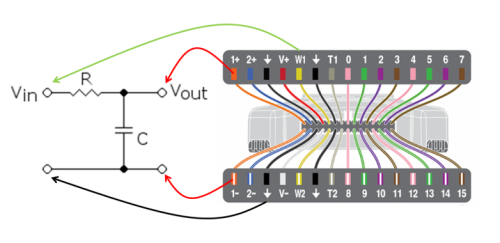 Płytka Analog Discovery 2 może służyć także do pomiaru charakterystyk układów analogowych. W tym przykładzie zostanie przedstawiony sposób pomiaru charakterystyki punkt po punkcie. Do pomiaru zostanie wykorzystany filtr dolnoprzepustowy RC pierwszego rzędu. Na rysunku 8 zilustrowano schemat dołączenia płytki AD2 do filtru. Zastosowano w nim R=1 kV i C=1 mF, co daje częstotliwość odcięcia rzędu 160 Hz.