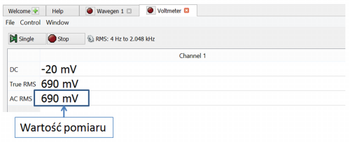 Do pomiaru charakterystyki filtru jest wymagany sygnał sinusoidalny o zadanej częstotliwości i amplitudzie 1 V. Taki sygnał można uzyskać korzystając z generatora funkcyjnego w AD2 (wavegen). Pomiar charakterystyki zostanie wykonany pośrednio poprzez pomiar napięcia AC RMS (rysunek 9). Aby uruchomić generator funkcyjny, należy kliknąć pole Wavegen w oknie głównym programu Waveforms.