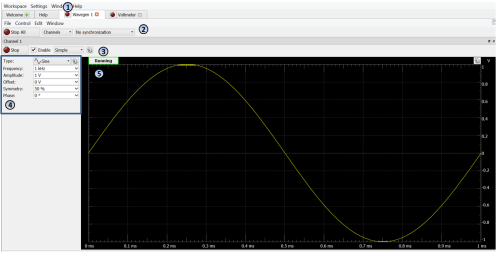 Okno konfiguracji generatora przedstawiono na rysunku 10. W polu zakładki (1) jest wyświetlana nazwa generatora i przycisk „u/=”, którym włączamy lub wyłączamy moduł. W wypadku zwarcia lub zbyt dużego obciążenia, generator wyłącza się automatycznie. W polu (2) znajdują się ustawienia globalne – włączenie/wyłaczenie wszystkich kanałów, wybór kanałów (channel) oraz ustawienia synchronizacji (np. generowanie dwóch przebiegów sinusoidalnych o różnej częstotliwości, ale zsynchronizowanych fazowo). Kolejne pole (3) to ustawienia ogólne konkretnego kanału – włączenie/wyłączenie i tryb działania : dla potrzeb przykładu wykorzystywany będzie jedynie tryb simple: możliwe jest generowanie podstawowych kształtów sygnałów i zmiana ich podstawowych parametrów. Parametry ustawiane są w polu (4) :