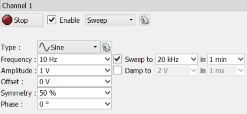 Przemiatanie częstotliwości – „sweep from 10 Hz to 20 kHz in 1 min” oznacza, że częstotliwość generowanego przebiegu sinusoidalnego będzie zmieniała się od 10 Hz do 20 kHz w czasie 1 minuty. Ta zmiana jest wykonywana w pętli nieskończonej.