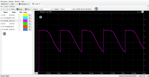 Aby rozpocząć akwizycję danych, należy kliknąć pole logger w głownym oknie programu WaveForms. Okno modułu logger z już zmierzoną charakterystyką filtru przedstawiono na rysunku 12. W polu (1) można skonfigurować parametry ogólne akwizycji danych: