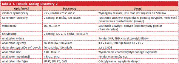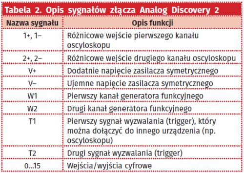 Funkcje płytki Analog Discovery 2 wymieniono w tabeli 1. Oprócz wymienionych istnieje też możliwość implementacji innych interfejsów za pomocą skryptów.