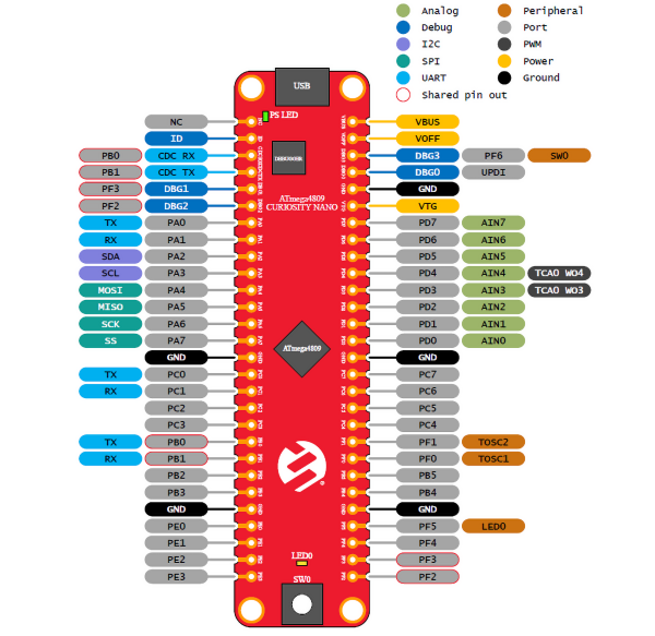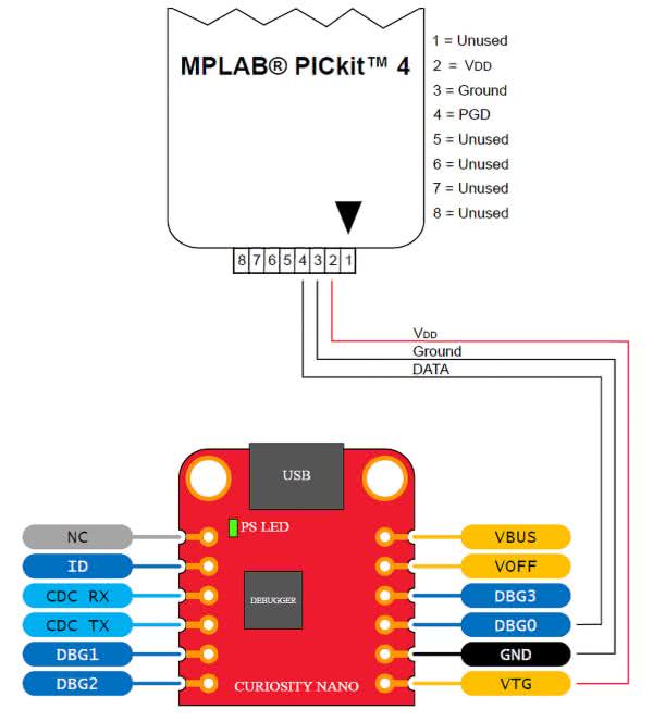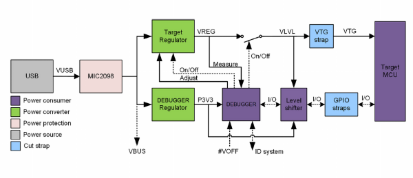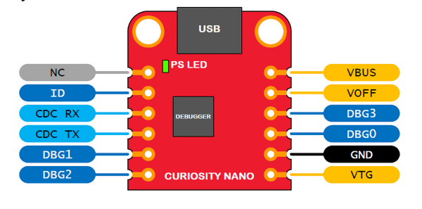 Cały układ: debugger i mikrokontroler są zasilane z portu USB. Z punktu widzenia magistrali USB debugger jest urządzeniem typu composite i zawiera kilka interfejsów: debuggera, pamięci masowej, Data Gateway i portu wirtualnego COM (CDC). Port wirtualny COM jest połączony z interfejsem UART mikrokontrolera ATmega4809.