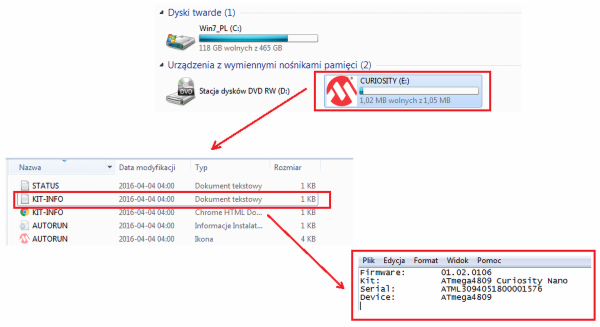 Po ich zainstalowaniu moduł jest widoczny jako dysk pamięci masowej o nazwie "CURIOSITY". Jego zawartość to kilka plików, w tym dwa tekstowe KIT-INFO i STATUS. W pliku KIT-IFO są umieszczone informacje o dacie firmware, typie płytki, numerze seryjnym i typie mikrokontrolera (rysunek 7).