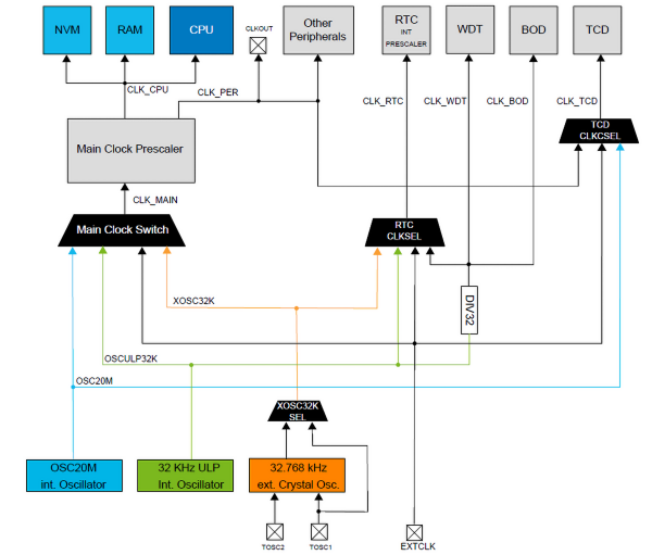 Tu również nie da się zablokować mikrokontrolera ustawiając, na przykład, taktowanie z zewnętrznego źródła. Przełączenie na inne źródło taktowania i zmiana podziału preskalera odbywa się programowo przez zapis rejestru CLKCTRL. Zapobiega to skutecznie zablokowaniu mikrokontrolera, bo po restarcie można go zmienić programowo.