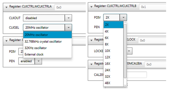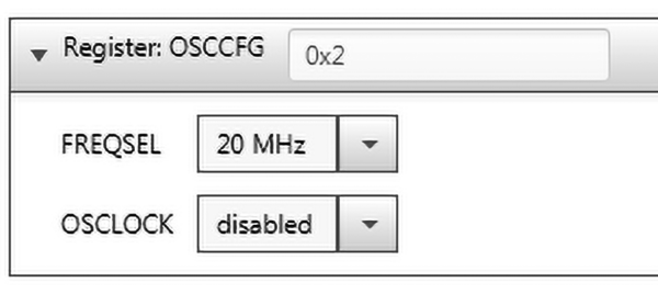 W oknie system module w zakładce Register odnajdujemy rejestr OSCCFG i ustawiany tam FREQSEL=20 MHz i OSCLOCK wyłączony. W kolejnym kroku ustawiamy w rejestrze CLKCTRL docelowe źródło taktowania mikrokontrolera. Dla przypomnienia, może to być oscylator RC 20 MHz (OSC20M), oscylator RC 32 kHz, oscylator kwarcowy 32768 Hz lub zegar zewnętrzny.