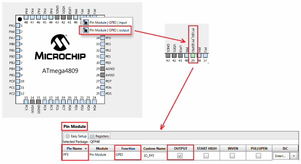 Ustawienie wyprowadzenia jako wyjściowego GPIO powoduje zmianę koloru na zielony i pojawienie się opisu funkcji wyprowadzenia. Jednocześnie w oknie Pin Module zostanie pokazany wpis, w którym można konfigurować dodatkowe ustawienie, na przykład, podciąganie do plusa zasilania lub sposób wyzwalania przerwania zewnętrznego skojarzonego z danym wyprowadzeniem. Kod wygenerowany na podstawie konfiguracji wykonanej za pomocą MCC pokazano na listingu 3.