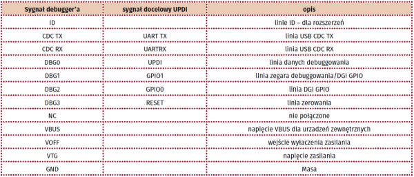 Na rysunku 2 p okazano w yprowadzenia z wiązane z USB C omposite układu debuggera. Cały układ jest zasilany z portu USB napięciem z zakresu 4,4...5,25 V . Do zasilania mikrokontrolera pełniącego wszystkie funkcje debuggera jest przeznaczony stabilizator LDO o napięciu wyjściowym +3,3 V. ATmega4809 jest zasilany kolejnym stabilizatorem LDO, dostarczającym napięcia programowanego przez układ debuggera - od +1,8 V do VBUS.