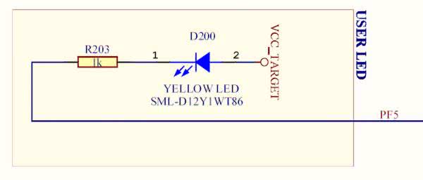 Mamy skonfigurowane taktowanie i przechodzimy teraz do napisania "nieśmiertelnego" programu migania diodą LED umieszczoną na płytce modułu. Dioda jest dołączona przez rezystor 1 kV ograniczający prąd katodą do linii portu PF5. Anoda diody jest połączona z napięciem zasilającym mikrokontroler (rysunek 19). Aby sterować diodą trzeba linię portu PF5 ustawić jako wyjściową.
