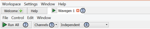Na rysunku 1 pokazano interfejs globalnych ustawień generatora funkcyjnego. Etykieta zakładki (1) zawiera przycisk globalnego włączenia generatora zsynchronizowany z przyciskiem Run All (2). Liczbę ustawianych kanałów można wybrać w polu Channels (w AD2 są dostępne dwa niezależne kanały generatora).