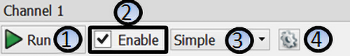 Pole Na rysunku 2 pokazano globalne ustawienia kanału. Pole (1) umożliwia włączenie pojedynczego kanału. Znacznik Enable (2) na stałe włącza lub wyłącza kanał. Pole (3) umożliwia wybranie trybu. Ikona zębatki (4) służy ustawieniu poziomu napięcia, kiedy kanał jest wyłączony: napięcie proporcjonalne do wartości pierwszej próbki lub wartości składowej stałej.