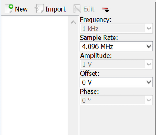 Na rysunku 5 zilustrowano interfejs trybu "custom" generatora. Przycisk "New" umożliwia dodanie nowego przebiegu - otwiera okno pokazane na rysunku 6.