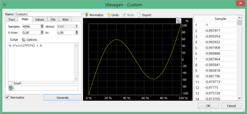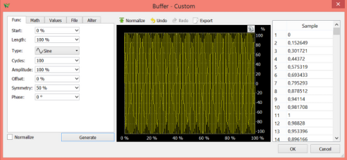 Po lewej stronie jest umieszczony interfejs tekstowy syntezy kształtu przebiegu. Na środku znajduje się wykres przedstawiający kształt przebiegu. Przycisk "Normalize" umożliwia dostosowanie amplitudy do największej możliwej wartości. Po prawej stronie jest wyświetlana tabela z wartościami poszczególnych próbek.