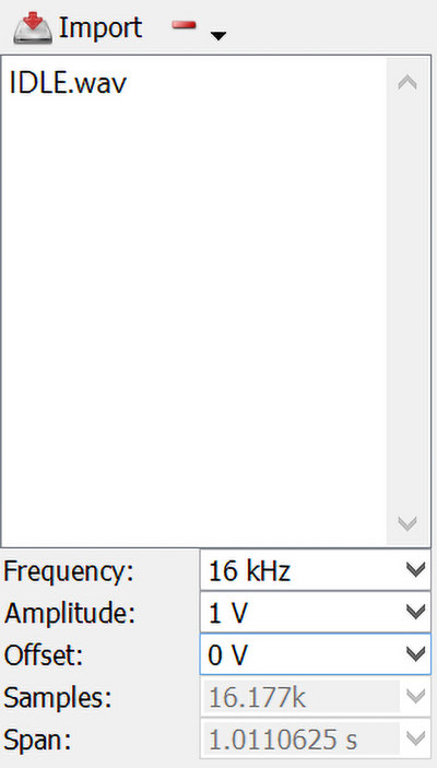 Tryb "play" umożliwia odtwarzanie pliku dźwiękowego. Przycisk "Import" (rysunek 7) służy do wczytania pliku, natomiast "-" usuwa plik. Lista wczytanych plików jest pokazywana poniżej przycisku "Import". Parametry dźwięku znajdują się w dolnej części interfejsu: