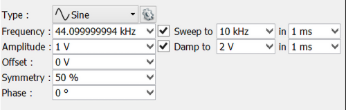- Sweep to X [Hz] in Y [ms] - przemiatanie częstotliwości z bazowej do częstotliwości X w czasie Y.