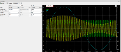 Na rysunku 9 pokazano ostatni tryb generatora - modulacja AM i FM. Nośna oraz przebieg modulujący amplitudę lub częstotliwość są wybierane jak w trybie "simple". Po prawej stronie znajduje się wykres modulacji - dla danego przykładu jest to modulacja AM.