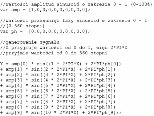 W tym przykładzie zostanie przedstawiony sposób tworzenia przebiegu użytkownika (custom). Będzie on miał charakter generatora addytywnego - synteza kształtu za pomocą sumy 10 przebiegów sinusoidalnych o częstotliwościach będących wielokrotnościami częstotliwości podstawowej (harmoniczne).