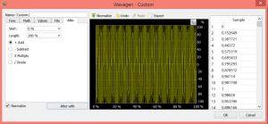 Na początku przebieg zawiera same zera, więc pierwszą operacją będzie dodanie pierwszego przebiegu. Należy kliknąć przycisk "Alter with" i wybrać żądany przebieg, jak na rysunku 13. Przebieg wyjściowy po operacji dodawania pokazano na rysunku 14. Ma on kształt sinusoidalny, więc teraz można pomnożyć go, na przykład, przez przebieg trójkątny. W tym celu należy zaznaczyć opcję "X Multiply", kliknąć przycisk "Alter with" i wybrać przebieg trójkątny. Okno edycji przebiegu po wykonaniu operacji mnożenia pokazano na rysunku 15.