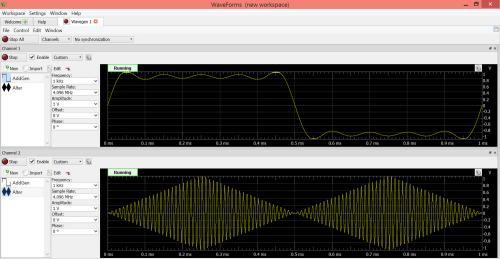 Jak wspomniano we wstępie, generator funkcyjny wbudowany w AD2 umożliwia nie tylko generowanie przebiegów o podstawowych kształtach, ale również udostępnia użytkownikowi zaawansowane metody umożliwiające uzyskanie niemal dowolnych sygnałów testowych: