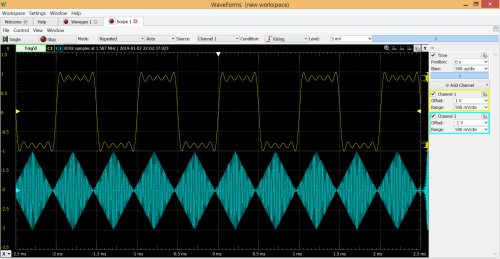 Pomiar jest wyzwalany w momencie, gdy narasta napięcie w pierwszym kanale oscyloskopu i jego wartość osiągnie 5 mV (ustawienie wyzwalania w górnym panelu). Konfigurowanie skali i przesunięć odbywa się w panelu po prawej stronie. Aby dwa kanały mogły być wyświetlane niezależnie, należy je przesunąć względem siebie (przesunięcie pierwszego kanału o +1 V, a drugiego kanału o -1 V).