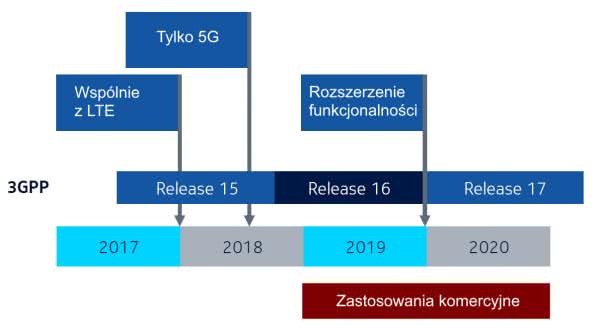 Pierwsza wersja specyfikacji sieci 5G ujrzała światło dzienne 15 grudnia 2017 roku, co w założeniu pozwalało na zastosowanie komercyjne 5G w 2019 r. Początkowo 5G wdrażano testowo, obok technologii LTE. Pełną specyfikację dla funkcjonujących niezależnie, samodzielnie sieci 5G ukończono w czerwcu 2018 r. Aktualnie prowadzone są prace testowe, a operatorzy, producenci sprzętu i oprogramowania prowadzą prace mające na celu szybkie wdrożenia komercyjne.