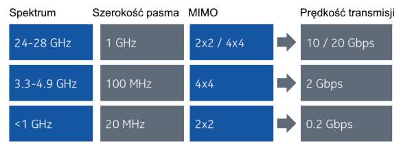 Nowy zakres częstotliwości. Duża prędkość transmisji danych wynosząca do 20 Gb/s wymaga pasma o szerokości 1...2 GHz dostępnego - jak można się spodziewać - w zakresie częstotliwości nośnej o dużej częstotliwości. Z tego powodu technologia 5G wymaga użycia milimetrowych fal radiowych, o częstotliwości powyżej 20 GHz. Pasma o mniejszej częstotliwości są wymagane do zapewnienia pokrycia sieci, natomiast o większej do uzyskania dużej prędkości transmisji oraz zwiększenia pojemności sieci.