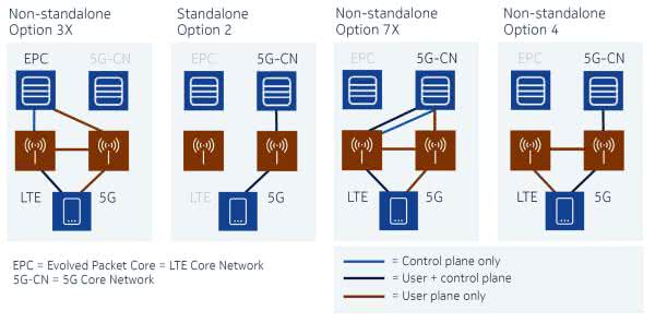 Technologię 5G można wdrożyć jako samodzielne rozwiązanie bez LTE. Takie podejście w 3GPP `nazywa się "Opcją 2". Sieć 5G może również korzystać z niestandardowych rozwiązań zapewniających łączność z LTE, co zostało zdefiniowane jako "Opcja 3". Pierwsze sieci 5G będą musiały korzystać z "Opcji 3", ponieważ zgodnie z 3GPP musi ona być dostępna przez pełne 6 miesięcy zanim zostanie użyta "Opcja 2". Łączność z użyciem dwóch standardów ma również inne zalety - umożliwia połączenie szybkości transmisji danych LTE i 5G oraz wykorzystanie istniejącego Evolved Packet Core (EPC) będącego platformą zapewniającą konwergentne połączenia głosowe i dane w sieciach 4G Long-Term Evolution (LTE). Architektura sieci 2G i 3G przetwarza i przełącza głos oraz dane za pośrednictwem dwóch oddzielnych subdomen: CS (Circuit-Switched) dla połączeń głosowych i PS (Packet-Switched) dla pakietowych połączeń danych. "Opcja 2" z siecią bazową 5G umożliwia korzystanie z nowych usług, w tym z krótkiego czasu latencji i szybszego zestawienia łącza, niż w LTE. Późniejsze wydania specyfikacji 3GPP prawdopodobnie również przyniesie możliwość podłączenia LTE eNodeB do sieci bazowej 5G z opcjami "7" i "4".