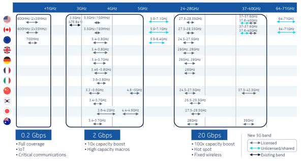 Technologia 5G jest pierwszą, którą opracowano w sposób umożliwiający wykorzystanie dowolnej częstotliwości radiowej z zakresu od 400 MHz do 90 GHz. Ten bardzo szeroki zakres częstotliwości nośnych jest wymagany do zapewnienia kombinacji dużej pojemności sieci, dużej prędkości transmisji, bardzo dobrego pokrycia obszaru oraz podwyższonej niezawodności. Sygnały o częstotliwości poniżej 6 GHz są używane dla uzyskania dobrego pokrycia obszaru oraz dla transmisji danych o prędkości rzędu kilku Gb/s. Dobre pokrycie obszaru jest niezbędne dla zapewnienia możliwości łączności urządzeniom IoT oraz poprawnego funkcjonowania takich aplikacji, jak na przykład zdalne sterowanie lub komunikacja z pojazdami autonomicznymi.