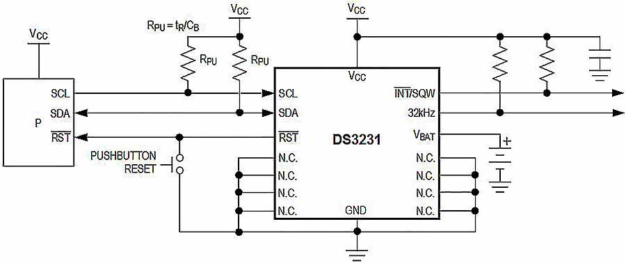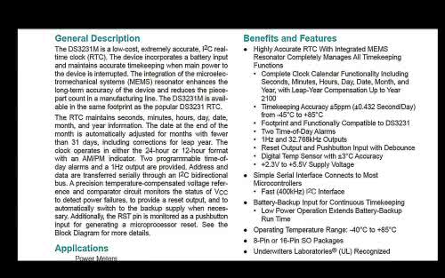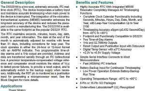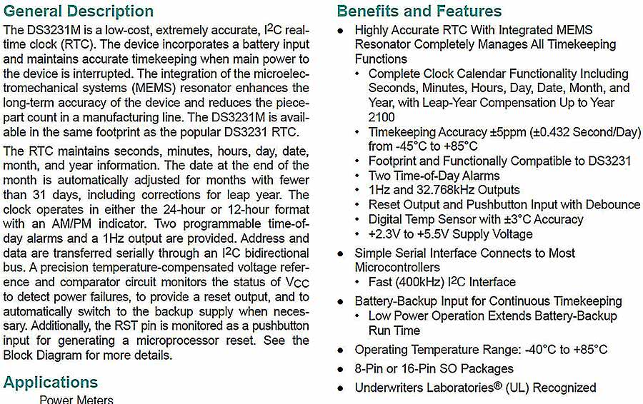 Układ ma wbudowany termometr, ale raczej mało dokładny. Może przydać się w roli sensora temperatury panującej w pokoju, ale raczej nie nadaje się do dokładnych pomiarów. Interfejs I²C pracuje z maksymalną częstotliwością zegarową wynoszącą 400 kHz. Układ ma wejście dla baterii podtrzymującej zasilanie zegara w razie zaniku napięcia głównego. Może przy tym pracować w dużym zakresie napięcia zasilającego - od 2,3 do 5,5 V, przy czym nie wymaga konwersji napięcia na szynie I²C. Pobór prądu w stanie aktywnym to 200 mA przy zasilaniu 3,3 V. Pobór prądu z baterii wynosi około 70 mA. Układ jest produkowany w obudowie SO16. Dostępne są również warianty w obudowie SO8 noszące oznaczenie DS3231MZ+.