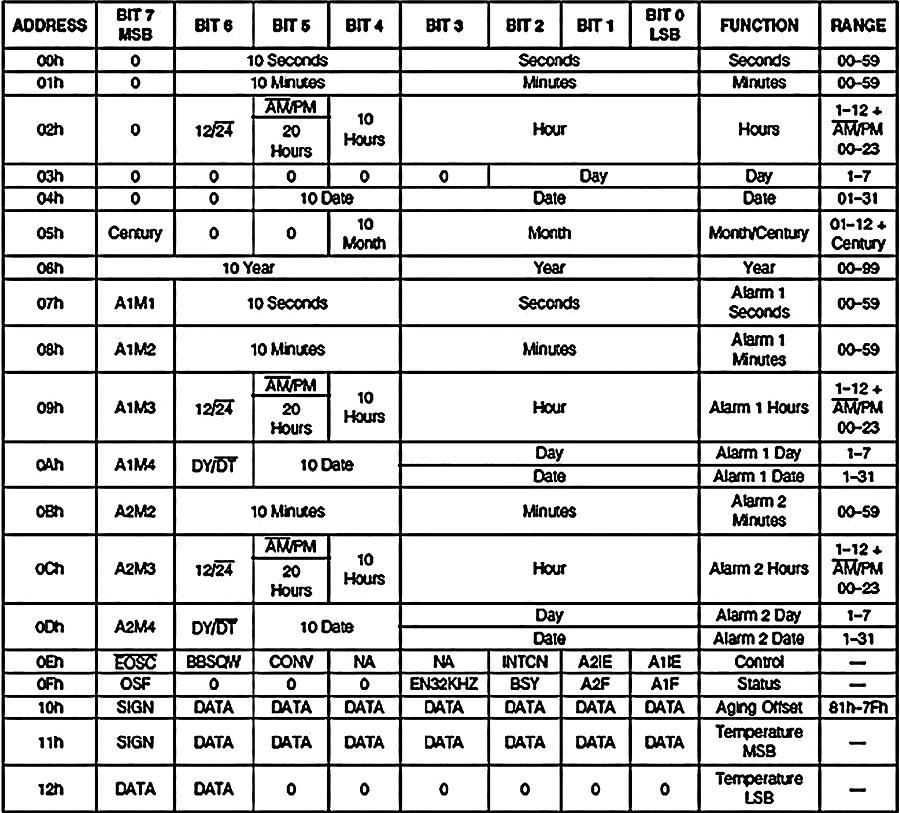 Wykaz rejestrów układu zaczerpnięty z jego dokumentacji pokazano na rysunku 4. Kolejne rejestry dostępne pod adresami od 0x00 do 0x06 zawierają sekundy, minuty, godziny (do wyboru - tryb 24- lub 12-godzinny), kolejny dzień tygodnia, dzień miesiąca, miesiąc i rok, przy czym rok to tylko dwie ostatnie cyfry daty, więc jeśli chcemy podać całą liczbę roku, to początek (aktualnie liczbę „20”) musimy dodać w programie. Dalej, mamy rejestry do ustawiania dwóch alarmów, rejestry Control, Status oraz Aging offset do ewentualnej korekty częstotliwości oscylatora. Na samym końcu rejestry, z których możemy odczytać temperaturę struktury układu.