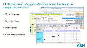 Do głównych narzędzi oprogramowania MDK-Pro wspomagających proces certyfikacji należą debugger z wbudowanymi narzędziami do testowania kodu oraz kompilator Arm C/C ++. Za pomocą analizy strumieniowej ETM, przy użyciu adaptera debugowania ULINKpro można korzystać z dodatkowych funkcji analizy. Arm Keil MDK-Professional zawiera debugger z wbudowanymi narzędziami do testów pokrycia kodu i profilowania wykonania. Funkcja oprogramowania, którą jest tzw. pokrycie kodu (code coverage), identyfikuje wykonywanie programu instrukcja po instrukcji, zapewniając dokładne testowanie aplikacji. Jest to podstawowe wymaganie pełnej weryfikacji oprogramowania i certyfikacji. Funkcjonalne normy bezpieczeństwa wymagają testów pokrycia kodu dla wielu poziomów integralności bezpieczeństwa. Z kolei Execution Profiler rejestruje statystyki czasu i wykonania instrukcji dla całego kodu programu. Wartości te są wyświetlane w edytorze mVision lub oknie Disassembly.