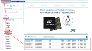 - MCU/MPU Selector przeznaczony do wyboru mikrokontrolera projektu według kryterium właściwości i wyposażenia w układy peryferyjne mikrokontrolerów STM32,