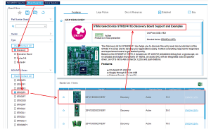 Board Selector wybiera mikrokontroler zabudowany w wybranej płycie ewaluacyjnej. ST oferuje szeroką gamę takich płyt z mikrokontrolerami wszystkich produkowanych serii i z bardzo różnym wyposażeniem, od bardzo prostych, elementów typu dioda i przycisk, po bardzo rozbudowane z dużymi wyświetlaczami LCD/TFT. Board Selector jest świetnym wsparciem dla projektanta wykorzystującego moduły firmowe. Na rysunku 3 pokazano selektor wyboru modułu z kryteriami: typ modułu Discovery i seria MPU STM32F4.