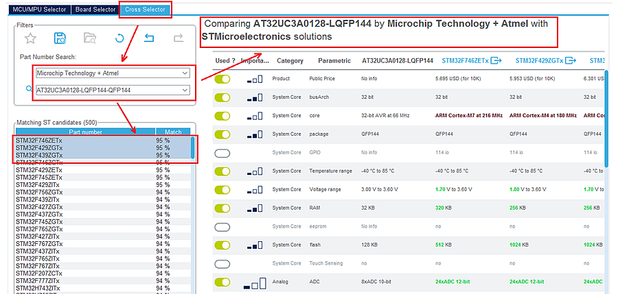 Zakładka wyboru Cross Selector pomaga projektantowi dobrać mikrokontroler STM32 na podstawie parametrów technicznych wybranych mikrokontrolerów innych producentów. W sytuacji kiedy projektant nie jest przywiązany do konkretnego producenta mikrokontrolera i może wybierać różne opcje, Cross Selector pozwala na szybkie i wygodne porównanie mikrokontrolera STM32 z wyświetleniem procentowej „zgodności” oraz graficznym przedstawieniem takich samych właściwości i różnic.