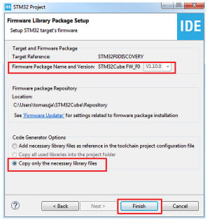 Kliknięcie na przycisk Finish kończy działanie kreatora projektu, a kliknięcie na Next otwiera okno z ustawieniami dotyczącymi firmowych bibliotek dla STM32 (rysunek 6). W chwili obecnej można wybrać tylko paczkę z bibliotekami w wersji v1.10.0. Opcje generowania kodu określają sposób dołączania plików bibliotecznych do projektu. W przypadku pracy z STM32CubeMX warto zaznaczyć opcje kopiowania do projektu tylko potrzebnych plików bibliotecznych.