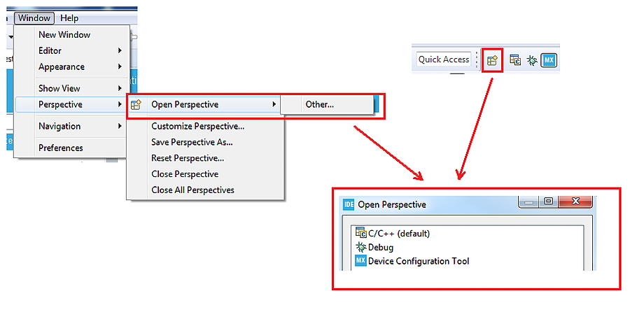 Te dwie perspektywy są uzupełniane o trzecią przeznaczoną do konfiguracji układów peryferyjnych i dodawania middleware. STAM32CubeIDE oferuje wszystkie trzy perspektywy przełączane z menu Window -> Pespective -> Open Pespective -> Other lub z paska narzędziowego umieszczonego w prawym górnym rogu ekranu - rysunek 7.
