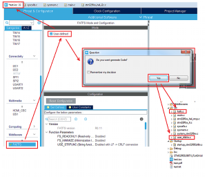 Opisywany niedawno na łamach „Elektroniki Praktycznej” konfigurator STM32CubeMX w wersji v5, jeżeli nie jest identyczny, to jest bardzo podobny do konfiguratora z perspektywy Device Configurator Tool zaimplementowanego w STM32CubeIDE. Dlatego nie będę powielał szczegółowego opisu działania poszczególnych funkcji. Zmiana konfiguracji wykonywana w perspektywie Device Configuration Tool może być wykonywana w dowolnym momencie pracy nad projektem. Kompletna informacja o konfiguracji jest zapisywana w pliku o rozszerzeniu .ioc umieszczonym w katalogu projektu Inc. Jeżeli zmienimy konfigurację, to ten plik ma status „nie zapisano zmian”. Przy każdej próbie zapisania program pyta się o to, czy wygenerować piki zmienionej konfiguracji. Można to zrobić jawnie przez polecenie save lub też przez wydanie polecenia kompilacji (build) projektu. Na rysunku 8 pokazano dodanie systemu plików FATFS do konfiguracji projektu. Plik test.ioc różni się od ostatnio zapisanego, co oznacza, że w konfiguratorze dokonano zmian. Przy wywołaniu polecenia build IDE otwiera okno z pytaniem, czy wygenerować kod na podstawie bieżącej konfiguracji projektu. Po kliknięciu na Yes konfigurator generuje nowy kod - zostało to również pokazane rysunku 8. W tym przypadku dodaje do projektu pliki fatfs.c i user_dikio.c.