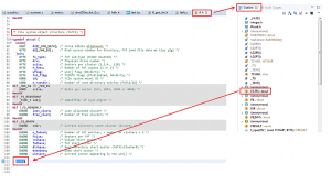 Pespektywa C/C++, jak już wspomniałem, jest przeznaczona do edycji i kompilacji kodu. Standardowo z lewej strony okna programu jest umieszczone okno Project Explorer z podkatalogami i plikami projektu przeznaczone do szybkiej nawigacji. Obok tego okna jest umieszczane okno zaawansowanego edytora tekstowego przeznaczonego do edycji kodu C/C++. Edytor oferuje kolorowanie kodu (słowa kluczowe, komentarze, stałe itp.) oraz działający on-line kontroler poprawności syntaktycznej kodu. Po wykonaniu kompilacji edytor wyświetla w liniach kodu informacje o wykrytych błędach i ostrzeżeniach kompilacji. Do sprawnego poruszania się w plikach źródłowych można wykorzystać okno Outline. Jest w nim zawarta lista symboli definicji (ciał) funkcji, stałych, zmiennych, struktur itp. Kliknięcie na element listy przekierowuje na symbol w pliku źródłowym. Jest to bardzo przydatne do poszukiwania fragmentów kodu w dużych plikach źródłowych. Na rysunku 9 jest pokazane wyszukiwanie struktury FATFS w pliku nagłówkowym ff.h.