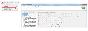 Pierwszym krokiem w przypadku każdego nowego projektu musi być skonfigurowanie opcji debuggowania. W tym celu klikamy na ikonkę z zielonym robaczkiem i wybieramy opcję Debug Configurations. Jeżeli mamy zamiar używać programowego symulatora klikamy dwa razy na C/C++ Application. Konfigurator automatycznie doda nasz projekt i będziemy mogli go sobie dalej konfigurować, lub używać do symulacji działania programu (rysunek 10).
