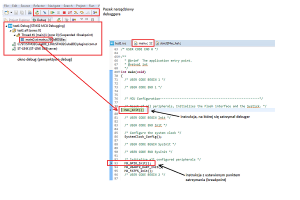 Po skonfigurowaniu debugger jest gotowy do pracy. Otwieramy perspektywę Debug i program automatycznie się zatrzymuje na pierwszej instrukcji pliki main.c. Podstawowe czynności wykonywane w trakcie uruchamiania kodu to: