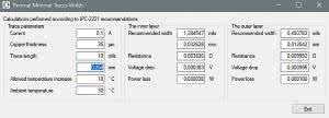Służy do wyznaczania minimalnej szerokości ścieżki na PCB, zgodnie z rekomendacją IPC-2221. Okno modułu pokazuje rysunek 2, parametry do wprowadzenia umieszczone są w lewej kolumnie: