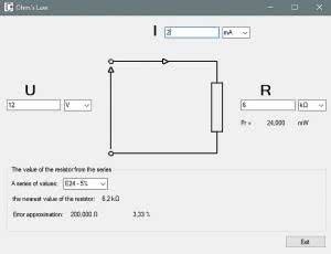 Służy do wyliczania parametrów obwodu zgodnie z prawem Ohma. W górnej części okna (rysunek 3) mamy schemat obwodu. W lewej części podajemy wartość napięcia. Można dodatkowo wybrać przedrostek wartości: μV, mV, V, kV. W górnej części podajemy wartość prądu. Także tu mamy wybór przedrostka: μA, mA, A, kA. Z prawej strony podajemy wartość rezystancji, również decydując o przedrostku: mΩ, Ω, kΩ, MΩ. Obliczenia wykonywane są zgodnie z kierunkiem ruchu wskazówek zegara, tzn. jeżeli podamy wartość prądu, automatycznie zostanie pobrana wartość napięcia i obliczona zostanie wartość rezystancji. Jeżeli wpiszemy wartość rezystancji, automatycznie zostanie pobrana wartość prądu i wyliczone zostanie napięcie. Analogicznie po podaniu napięcia: zostanie pobrana wartość rezystancji i wyliczony prąd. Dodatkowo dla rezystora zostanie wyliczona moc, jaka zostanie na nim wytracona dla podanych parametrów. W dolnej części okna jest sekcja doboru wartości rezystancji do wybranego przez nas typoszeregu wartości. Poszczególne pola oznaczają: