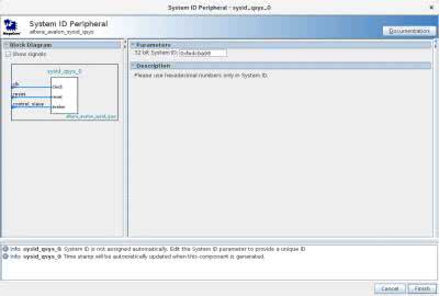Następnym elementem, który musimy dodać, jest pamięć RAM (Library → Basic Functions → On Chip Memory → On-Chip Memory (RAM or ROM)) - na potrzeby przykładu jej rozmiar został ustawiony na 16384 B. Pozostałe parametry pozostawiamy bez zmian, jak na rysunku 3. Ostatnim elementem bibliotecznym, który trzeba dodać do listy podsystemów, jest System ID Peripheral (Libary → Basic Functions → Simulation; Debug and Verification → Debug and Performance). Jego zadaniem jest ustalenie identyfikatora systemu, który jest sprawdzany, m.in. podczas programowania mikroprocesora. Jedynym jego parametrem jest 32-bitowy identyfikator, który może przyjąć dowolną wartość (rysunek 4).
