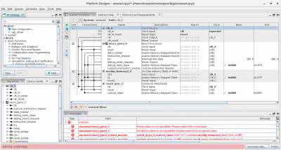 Mając dodane wszystkie potrzebne elementy biblioteczne, można przystąpić do łączenia sygnałów resetu, zegara oraz magistral pamięci pomiędzy poszczególnymi elementami. Sposób połączenia został przedstawiony na rysunku 5. Warto zwrócić szczególną uwagę na dwa źródła resetu: zewnętrzny sygnał clk_in_reset oraz debug_reset_request pochodzący z interfejsu JTAG i sposób prowadzenia magistral pamięci: instruction_master (pamięć programu) - do pamięci RAM oraz data_master (pamięć danych) - do pamięci RAM i pozostałych komponentów.