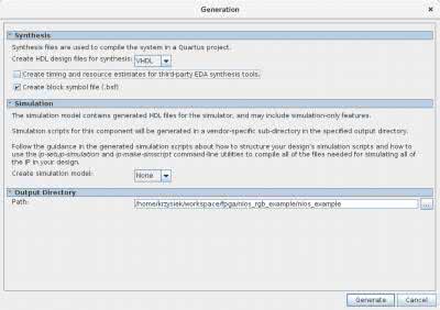 W tym momencie mamy skonfigurowany i gotowy do użycia mikroprocesor Nios II ze wszystkimi niezbędnymi do działania peryferiami w postaci jednego komponentu, który można dodać do projektu. Wystarczy go zapisać, a z menu Generate wybrać opcję Generate HDL, której okno zostało pokazane na rysunku 7. Tak wygenerowane pliki nie są automatycznie dodawane do projektu, dlatego w głównym oknie Quartusa należy wybrać opcję Project → Add/Remove Files in Project i dodać plik z rozszerzeniem qip, znajdujący się w katalogu z wygenerowanym systemem, np. nios_example/synthesis/nios_example.qip. Utworzony system można dodać do edytora schematów, klikając dwukrotnie w obszarze okna i w wyświetlonym dialogu wybierając plik z rozszerzeniem bsf znajdujący się wśród wygenerowanych poprzednio plików, np. nios_example/nios_example.bsf w katalogu głównym projektu. Teraz zajmiemy się dodaniem własnego komponentu i połączeniem go z Niosem II.