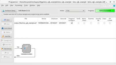 Po skonfigurowaniu pinów ponownie kompilujemy projekt, podłączamy programator i programujemy układ za pomocą opcji Tools → Programmer lub odpowiedniego przycisku na pasku narzędzi (rysunek 15). Do programowania wybieramy plik output_files/nios_rgb_example.sof. Brakuje już tylko jednego - programu dla Niosa II, który będzie sterował diodami RGB.