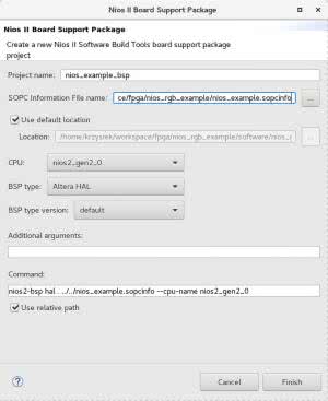 Razem z Quartusem dostarczane jest środowisko Eclipse, w którym możemy przygotować BSP (Board Support Package) oraz program dla Niosa II. Możemy je otworzyć z menu Tools → Nios II Software Build Tools for Eclipse lub bezpośrednio z katalogu instalacyjnego Quartusa (nios2eds/bin/eclipse-nios2).