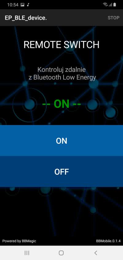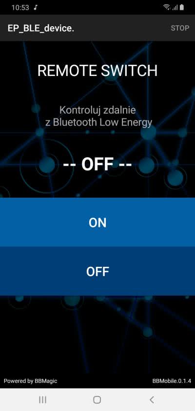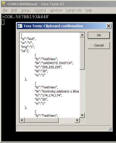 Mając powyższą wiedzę wracamy teraz do projektowanej aplikacji ‘REMOTE SWITCH’. Wszystkie zdefiniowane uprzednio kontrolki ułożymy na ekranie jedna pod drugą. Użyjemy zatem layoutu wertykalnego z listingu 8 i zobaczymy jaki otrzymamy efekt końcowy. Naciskamy ‘START’ w prawym górnym rogu aplikacji BBMobile i z listy urządzeń wybieramy ‘EP_BLE_device’. Na ekranie terminala pojawi się informacja o zestawionym połączeniu. Kopiujemy teraz przygotowany kod z listingu 8 (Ctrl+C), a następnie klikamy prawym przyciskiem myszy w oknie terminala i potwierdzamy chęć wysłania danych przyciskiem ‘OK’ (rysunek 1).