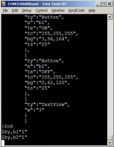 Konwencja komunikatu zdarzeniowego jest następująca: najpierw znaki ‘$by,’, a następnie nazwa kontrolki, która została uruchomiona i na koniec w cudzysłowie wartość obrazująca jej stan. Ponieważ zdefiniowana przez nas kontrolka Button sygnalizuje jedynie ‘tapnięcie’ w ekran, wartość ta jest zawsze równa 1.