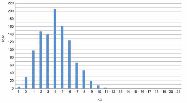 Po symulacji w komorze termicznej przeprowadzono analizę statystyczną. Obliczono, że 96,8% badanych elementów zwiększyła wartość rezystancji. Rozkład liczby zmian rezystancji w funkcji wielkości zmian rezystancji przedstawia rysunek 2.